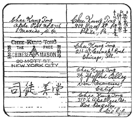 司徒美堂先生签名和纽约致公堂的印章及地址(翻印自陶行知的笔记本)