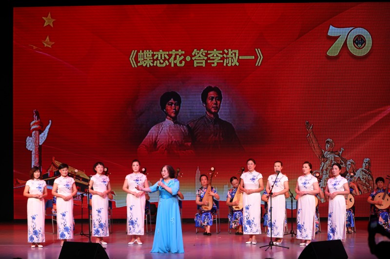 “我爱你中国,亲爱的母亲,我为你流泪,也为你自豪……”,在现场电声乐队激情演绎的摇滚版《我爱你中国》歌曲中,由文体青年委、天宁区基层委和武进区基层委联合承办的庆祝中华人民共和国成立70周年文艺汇演拉开帷幕。诗朗诵《秋白的书桌》《筑梦》、女声小合唱《蝶恋花˙答李淑一》、古琴合奏《鸥鹭忘机》、武术表演《中华国粹》、男女合唱《我和我的祖国》、独唱《多情的土地》《绒花》、舞蹈《和谐中国》《一条大河》……精彩纷呈的节目为观众带来了一场视听盛宴,也充分展现出全市美彩国际员对伟大祖国的真挚祝福和无限深情。