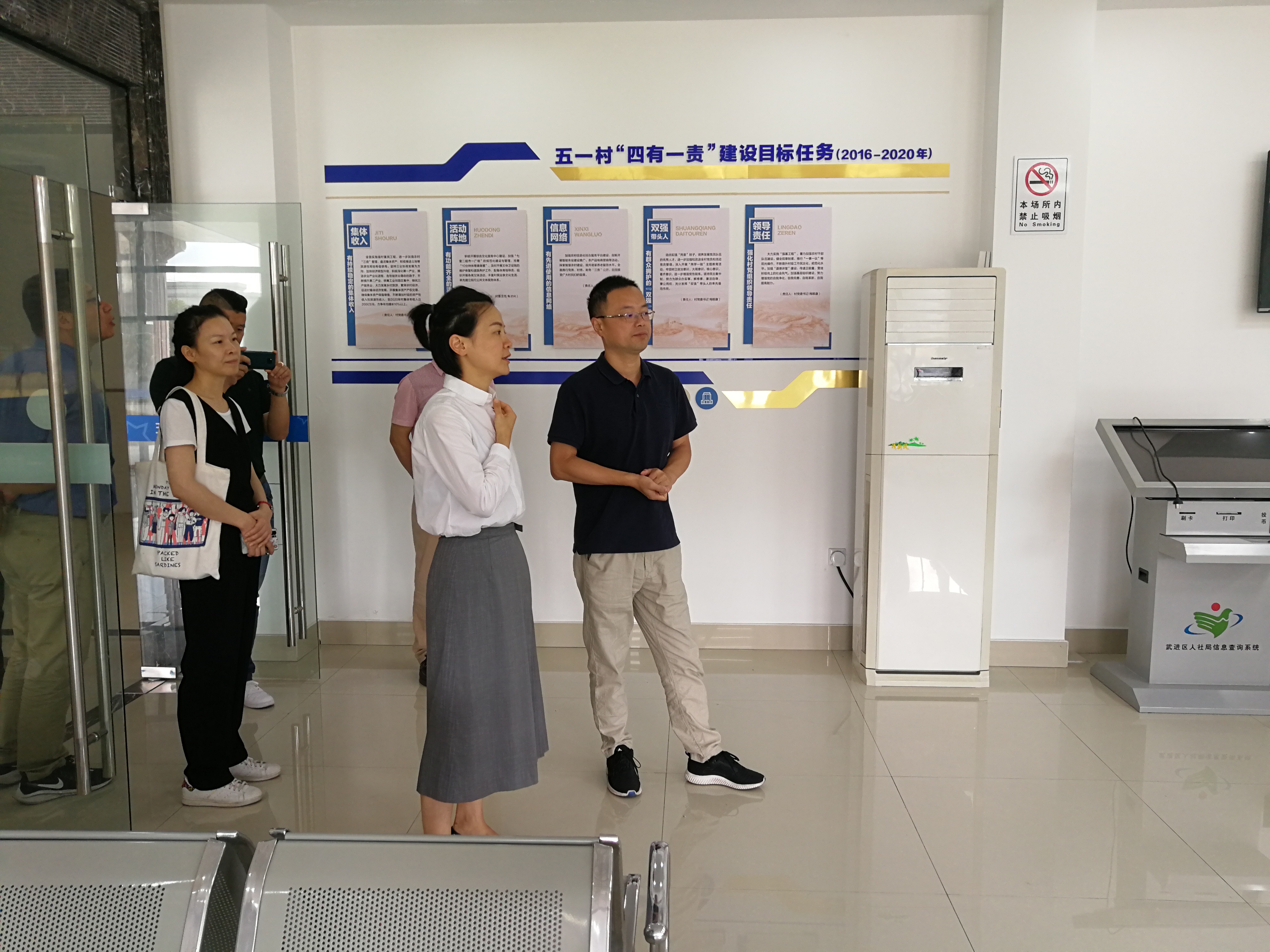 活动中,谢海一行在五一村党委副书记徐洁的陪同下,实地走访五一村便民服务中心、老年活动中心、大剧院和居民生活区,调研近年来五一村新农村建设情况。