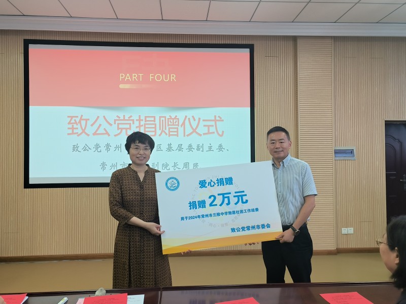 在开学典礼上,举行了捐赠仪式。市委会“关爱基金”在2024-2025学年度再次向兰陵中学的“致愿社团”捐赠2万元,以支持社团的各类活动和资助项目。市委会社服委副主委、天宁区基层委副主委周民代表市委会进行了捐赠,兰陵中学校长殷春霞代表“致愿社团”接受了捐赠。