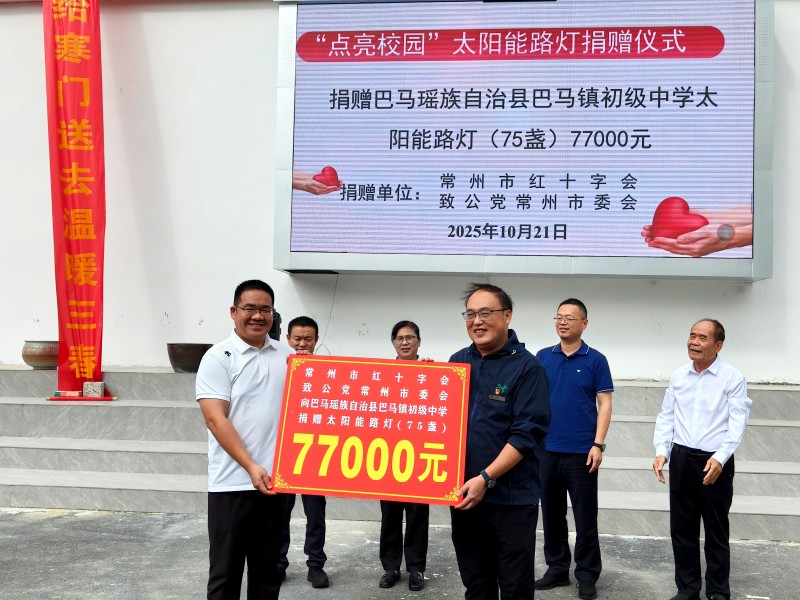 今年4月,美彩国际常州市委会在与巴马镇初级中学对接帮扶工作时,了解到学校硬件设施老旧,建设经费有限,夜间道路照明不足,给师生的学习和生活带来诸多不便。为此,市委会积极协调常州市红十字会,共同筹集77000元专项资金,支持学校改善户外照明条件。