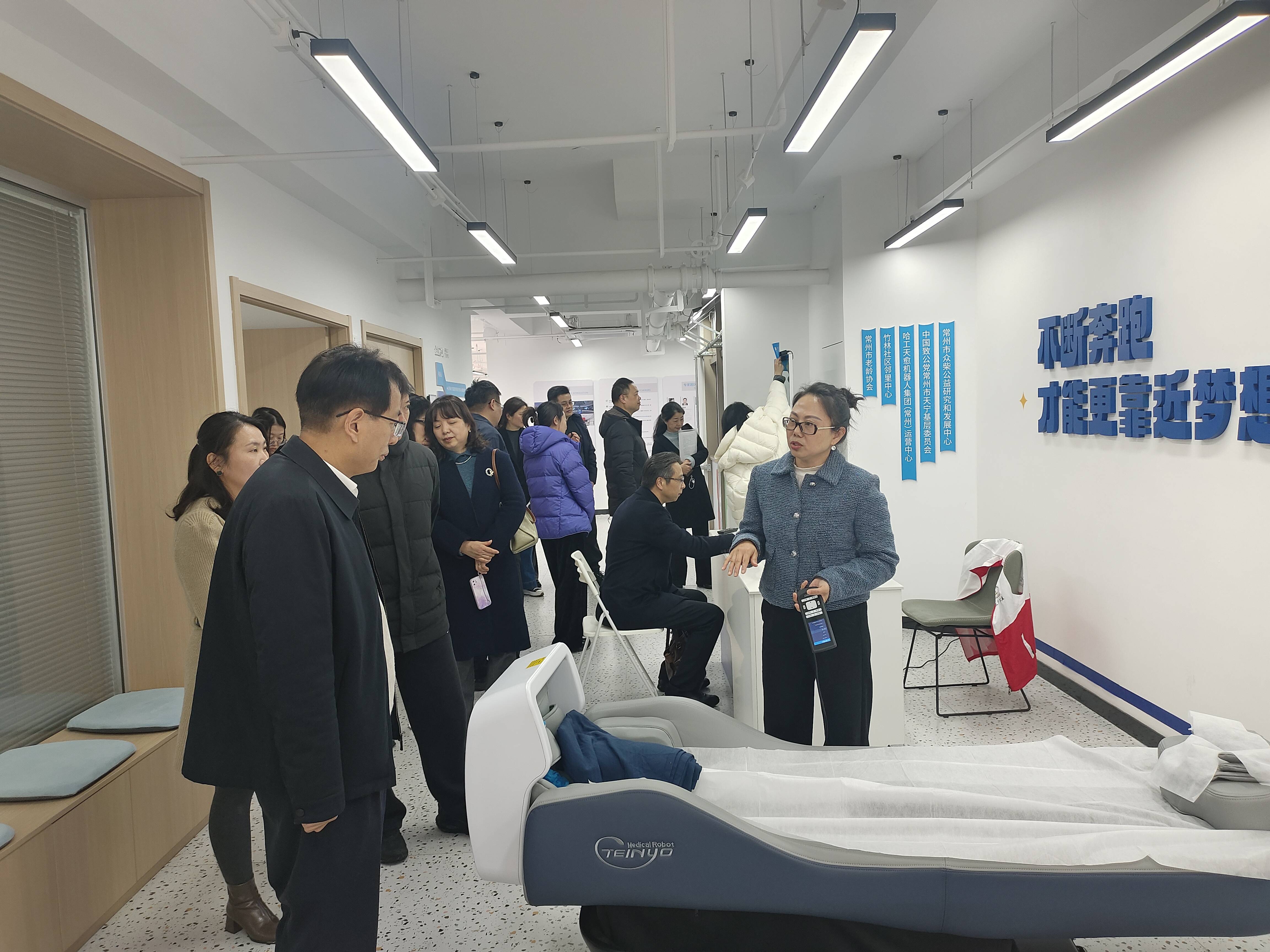 随后,调研组前往天宁区红梅街道竹林社区,参观了位于社区邻里中心四楼的AI健康小屋,深入了解智慧医疗设备在社区场景中的实际应用,重点考察智能健康监测、远程问诊、健康数据管理等服务模式的运行效果。竹林社区书记张颖陪同调研并作详细介绍。